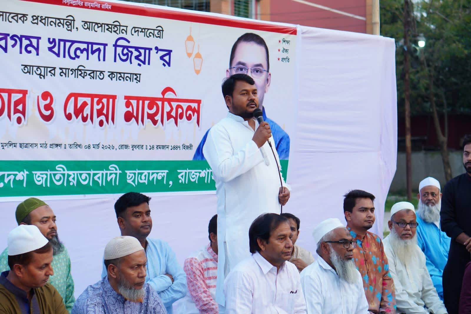 সাবেক প্রধানমন্ত্রী বেগম খালেদা জিয়া-এর রুহের মাগফেরাত কামনায় রাজশাহী কলেজ ছাত্রদলের উদ্যোগে ইফতার ও দোয়া মাহফিল অনুষ্ঠিত হয়েছে। বুধবার রাজশাহী কলেজ মুসলিম ছাত্রাবাস মাঠে এ কর্মসূচির আয়োজন করা হয়।