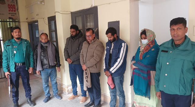 গ্রেপ্তারকৃতরা হলেন— মো. আল মামুন (৪২), মো. মাহবুব আলম (৪৬), মোছা. আনজুয়ারা খাতুন (২৫), মো. জুলফিকার আলী (৪০), মো. নয়ন আলী (২৭) এবং রায়হান কবির (৩০)। তবে অসুস্থতার কারণে রায়হান কবির বর্তমানে হাসপাতালে ভর্তি রয়েছেন।
