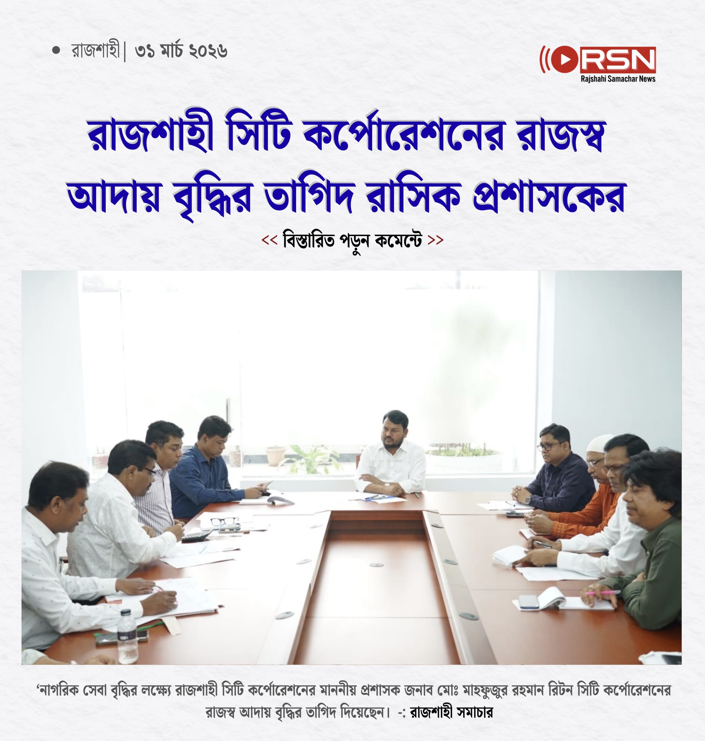 সভায় রাসিক প্রশাসক মোঃ মাহফুজুর রহমান রিটন বলেন, মাননীয় প্রধানমন্ত্রী জনাব তারেক রহমান আমাকে রাজশাহী মহানগরবাসীর সেবা করার সুযোগ দিয়েছেন। আমরা যথাযথভাবে নাগরিকদের সেবা করতে চাই। নাগরিক সেবা বৃদ্ধির লক্ষ্যে সরকারি-বেসরকারি হাল ও বকেয়া কর আদায়ের পাশাপাশি আইন অনুযায়ী নতুন আয়ের খাত তৈরি করতে হবে। যেসব খাতে সিটি কর্পোরেশন রাজস্ব বঞ্চিত হচ্ছে, সেসব খাত চিহ্নিত করে যথাযথ ব্যবস্থা গ্রহণ করতে হবে।